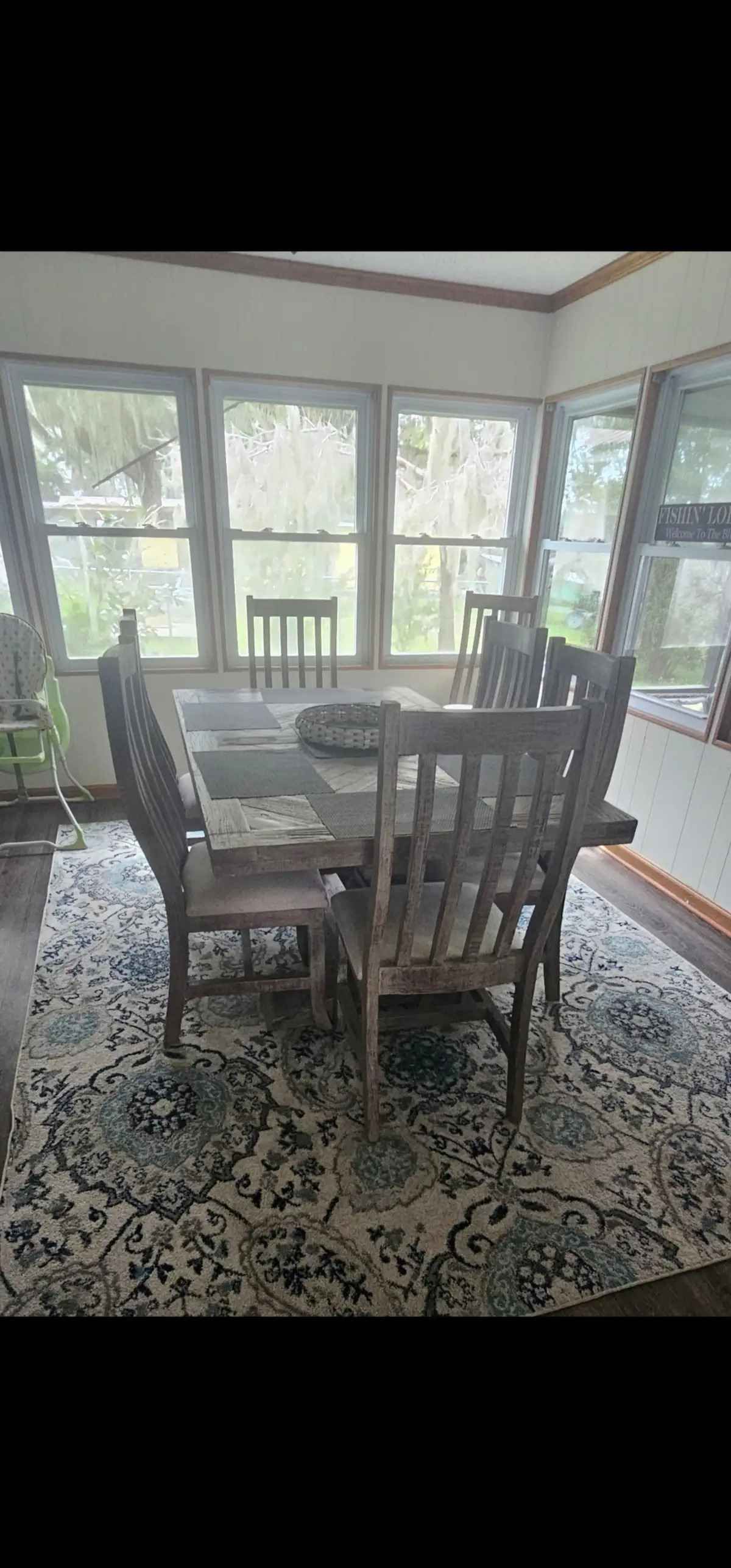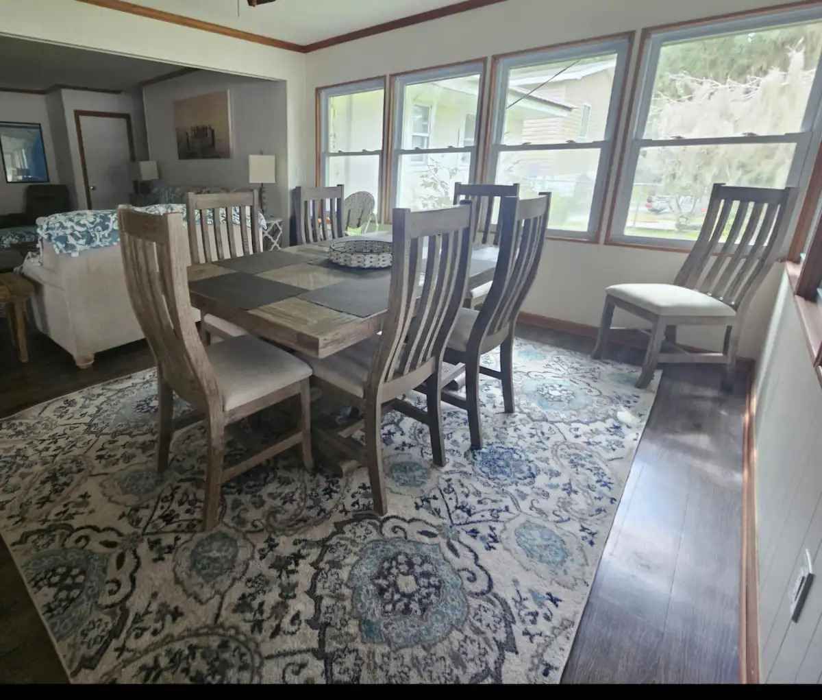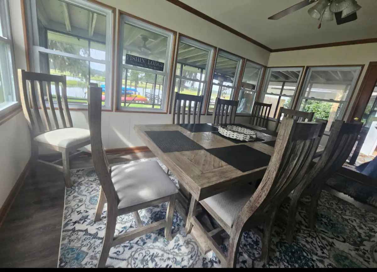 We have a large, functional, well equipped eat in kitchen that seats 4, a large dining table for 8 and comfy living room with large couch & armchairs offering ample seating all with a gorgeous view of the marsh.