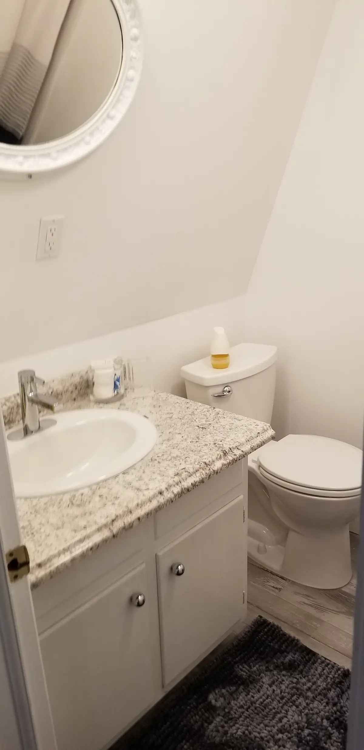 1 bathroom with tub on main floor, 2nd bathroom with shower in main bedroom on 2nd floor. Both bedrooms are on second floor