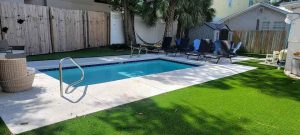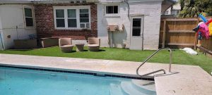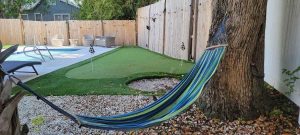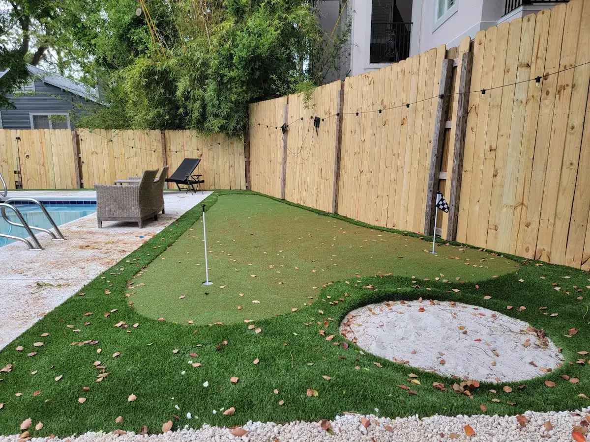 The newly renovated yard boasts a small inground pool for a refreshing dip, a unique putting green with sand trap, as well as generous seating areas to lounge and a firepit