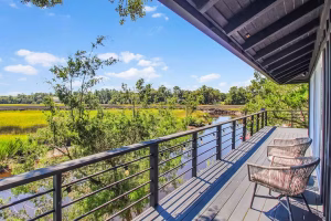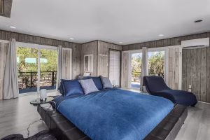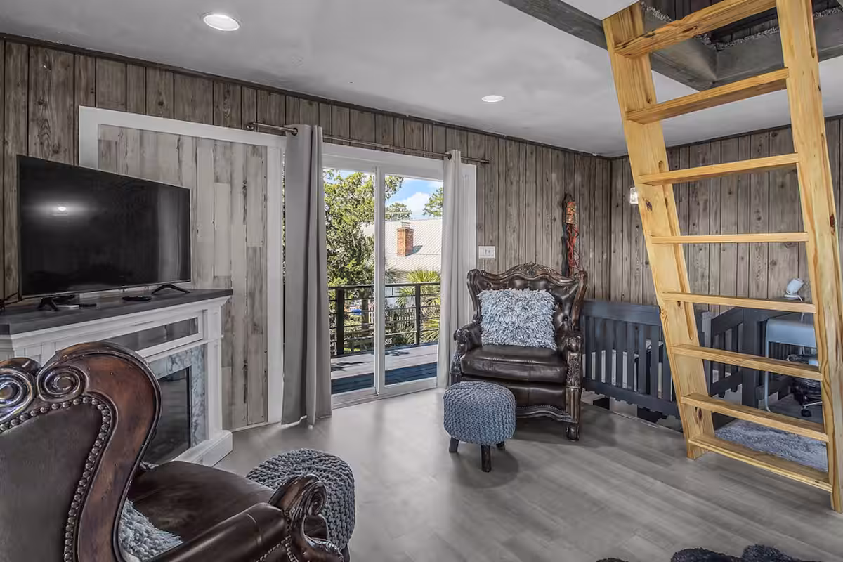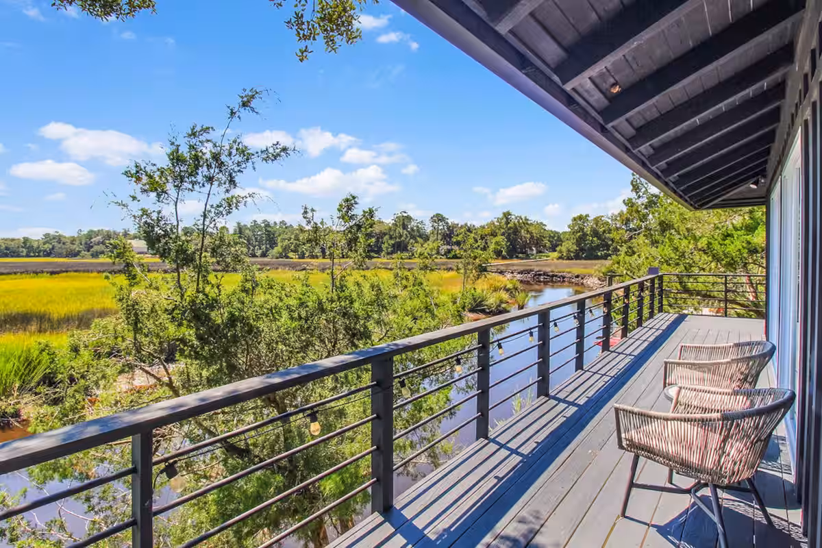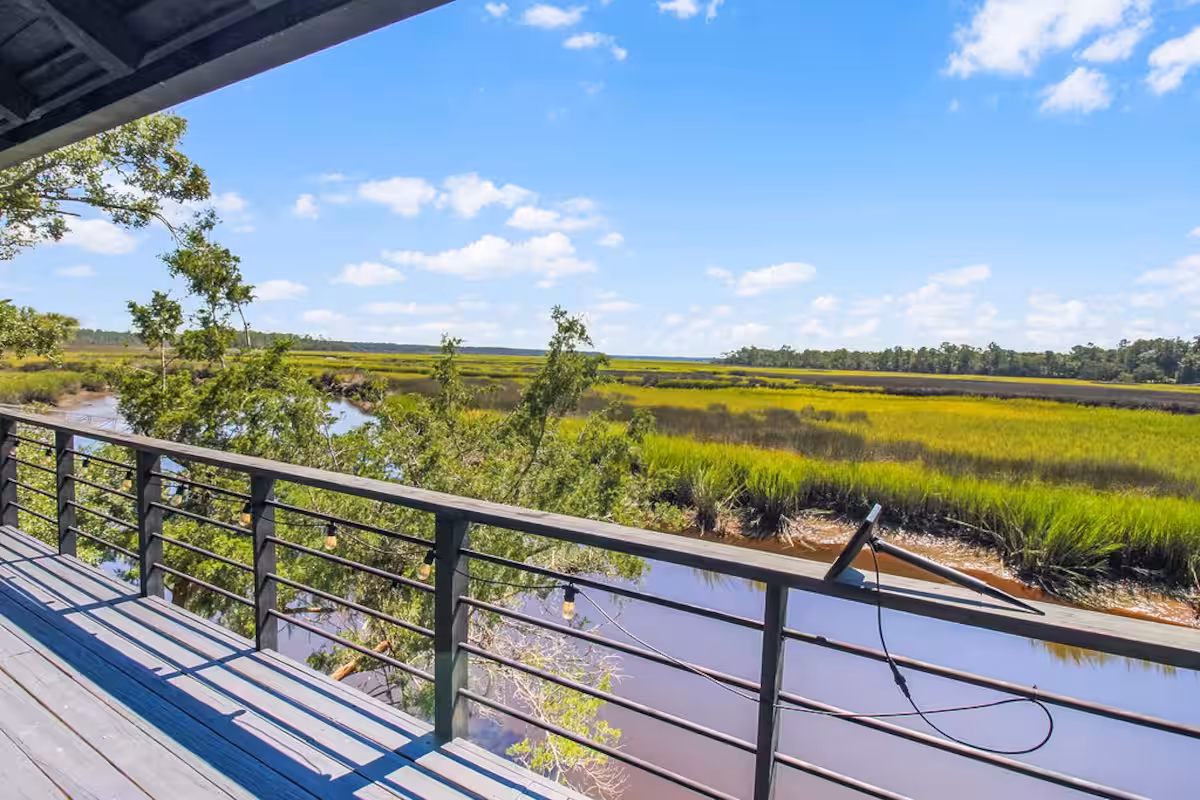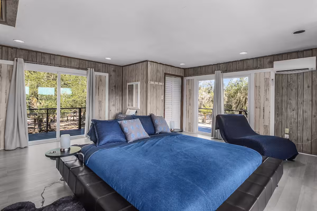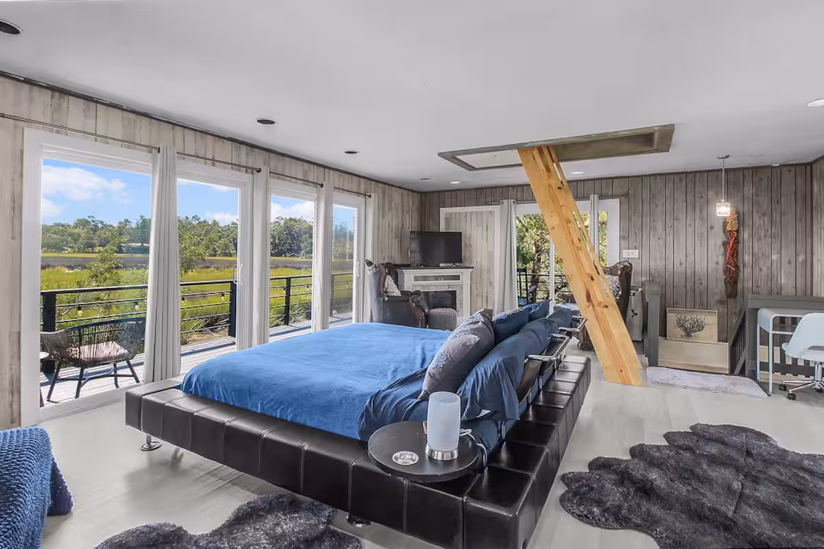 🛏️ Master Bedroom: A large, open space surrounded by windows, offering stunning views from the cozy leather King-size bed. Watch the sunrise right from your bed overlooking the marsh!
